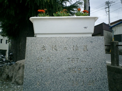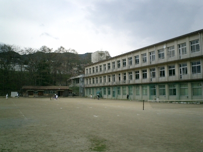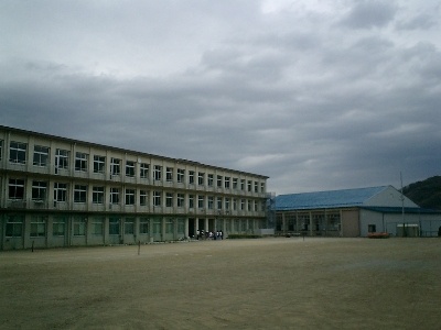 | 校門横の石碑。 | 校庭と校舎。 校舎の窓枠はアルミサッシにリフォームされている。 |