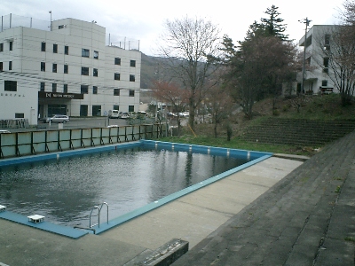 夏を待つプールです。 右側の川岸小の桜は開花したところ。 |
