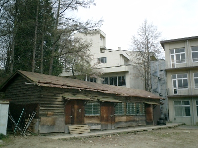 | 工作室は野球部やサッカー部の部室として利用されています。 浜先生がでてきそう...。 後ろの建物は増築された校舎。 |